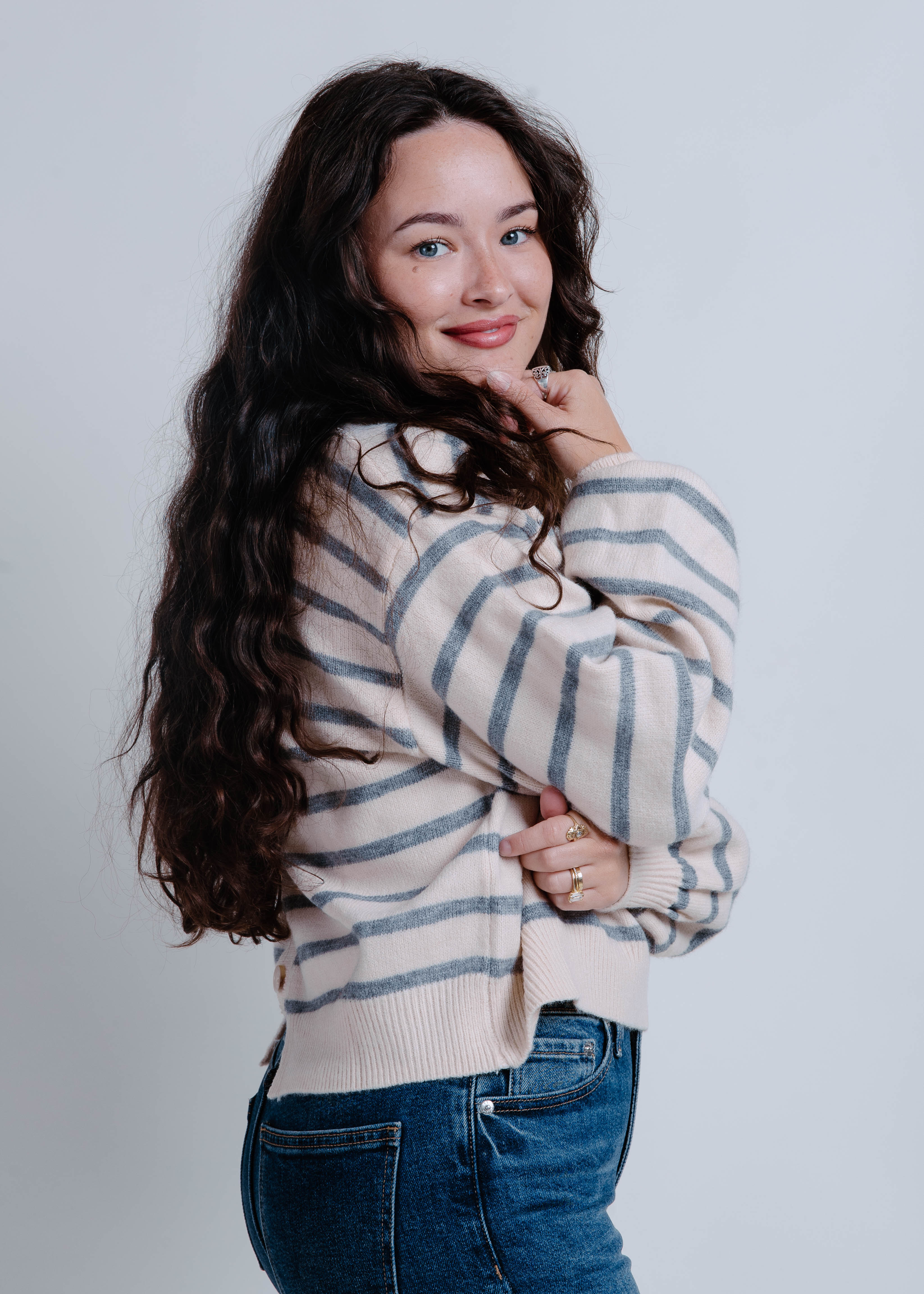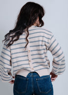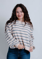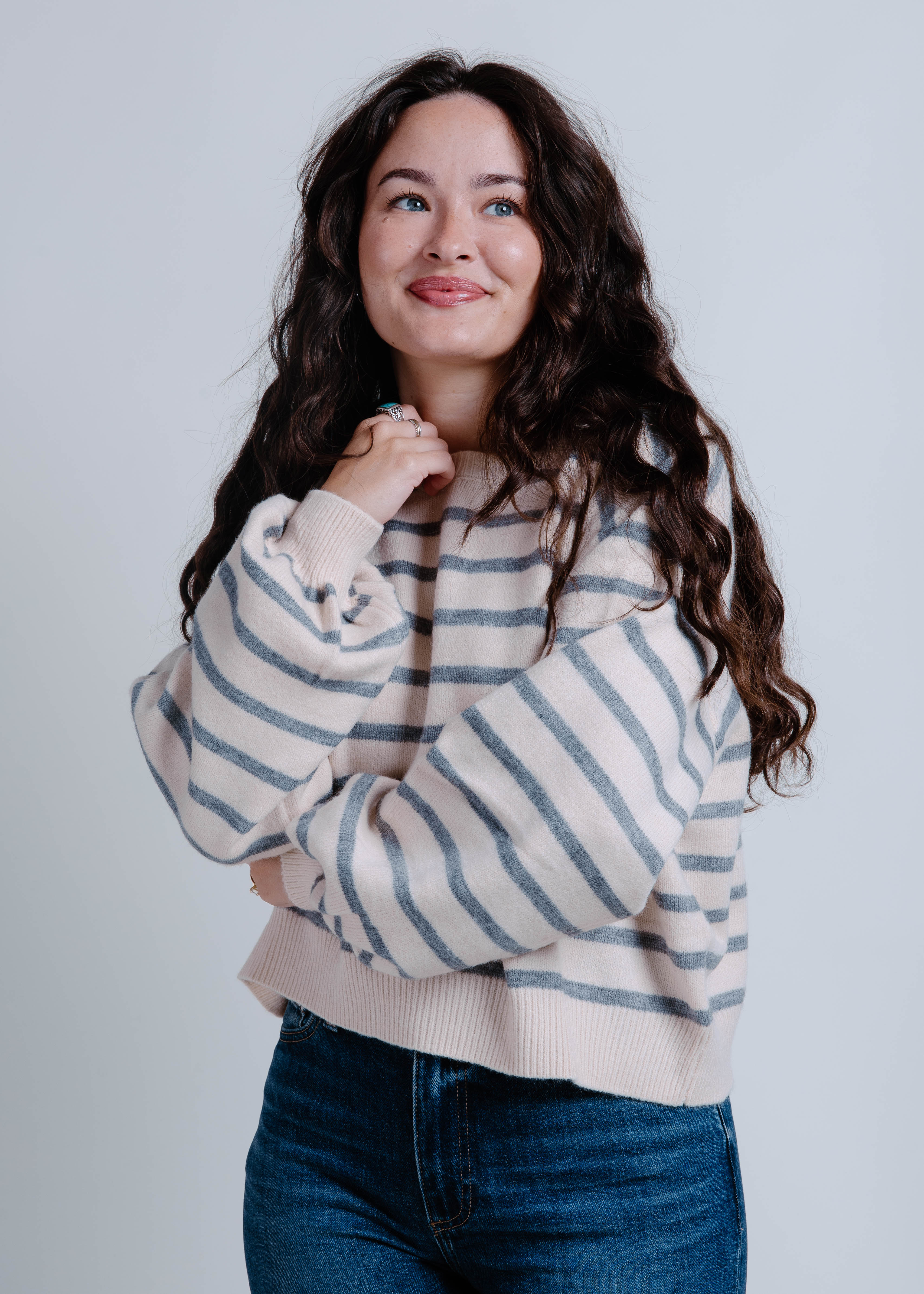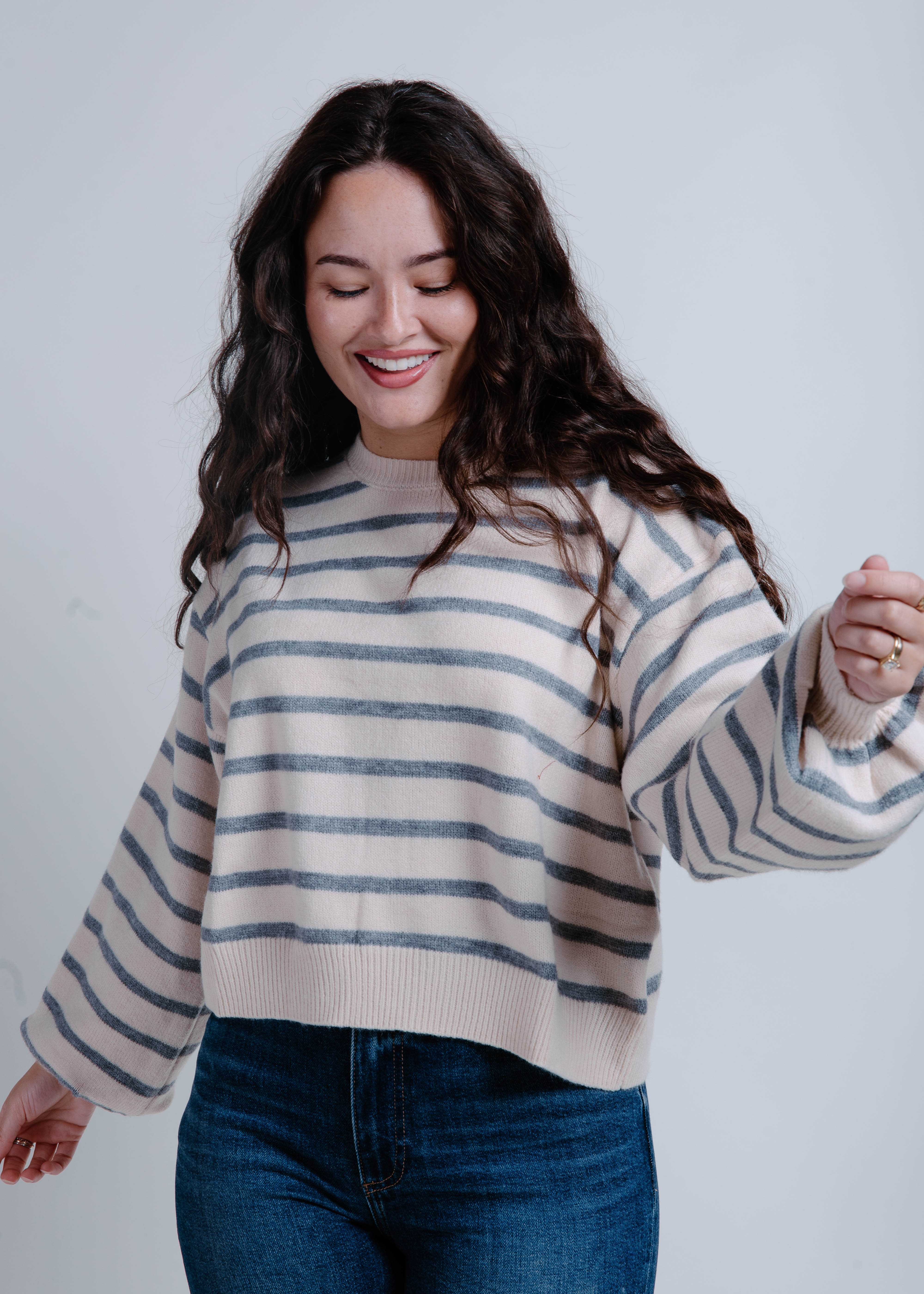 So pretty! Love the crop, buttons down the back, the grey on cream stripe and the puff sleeve