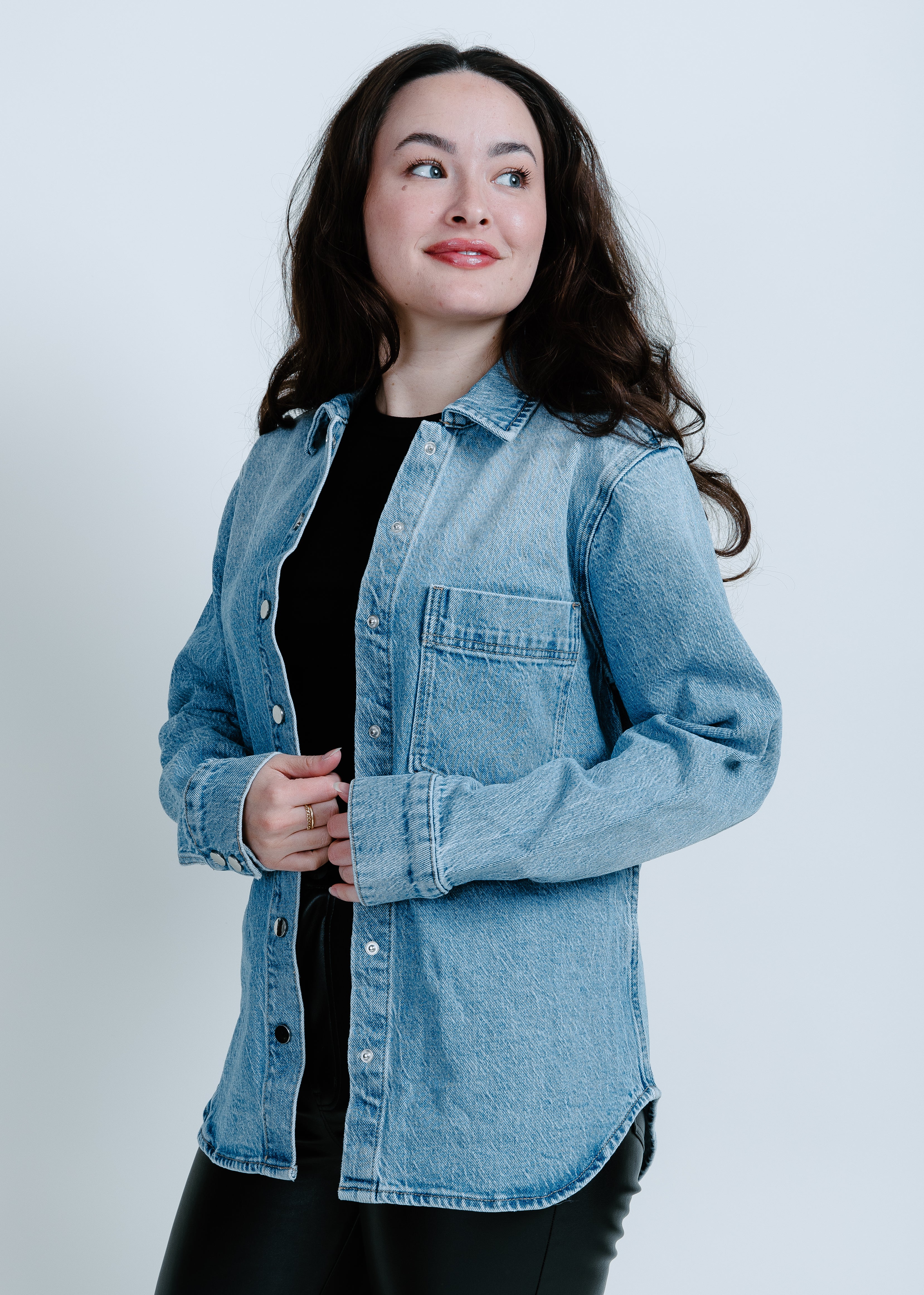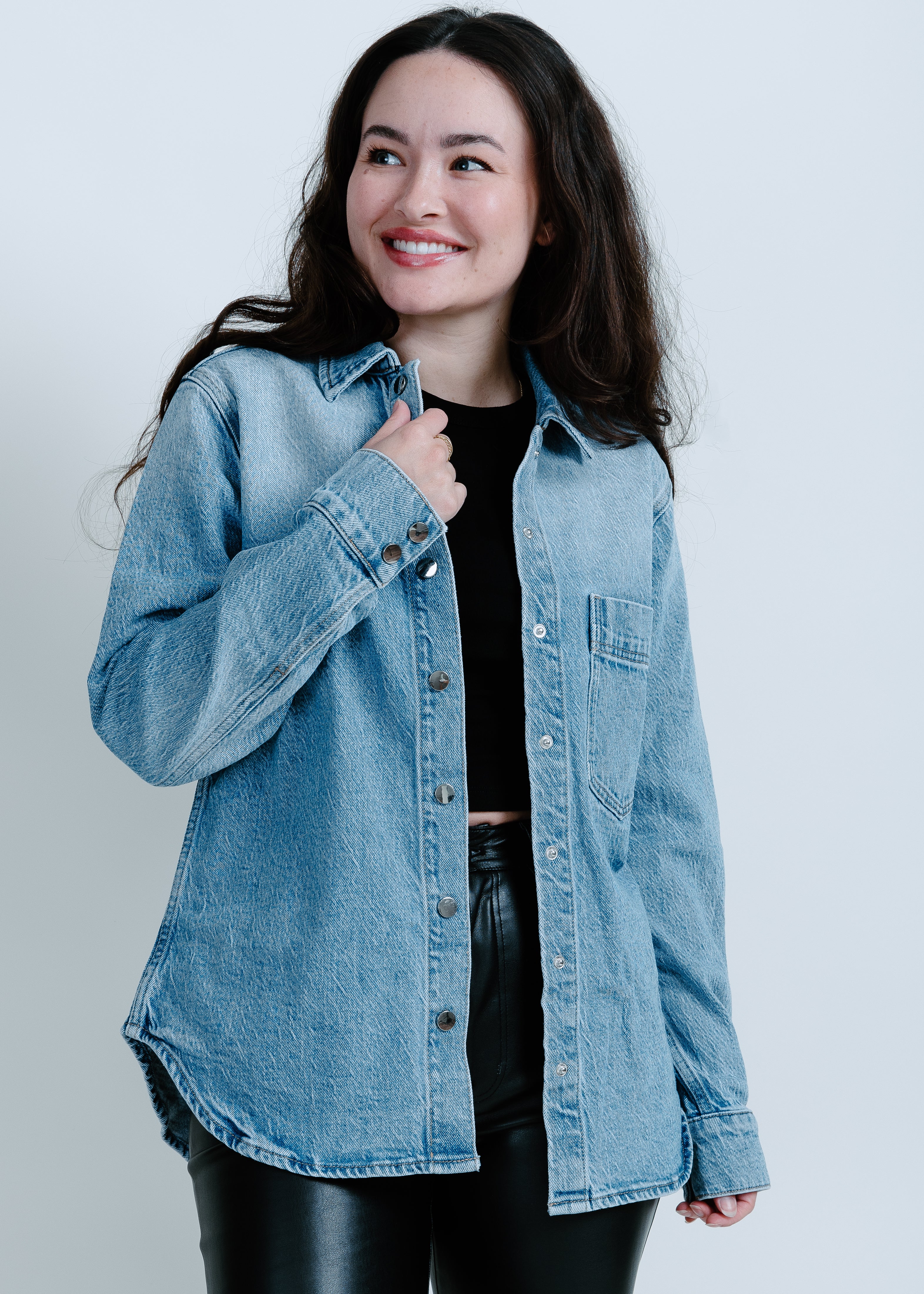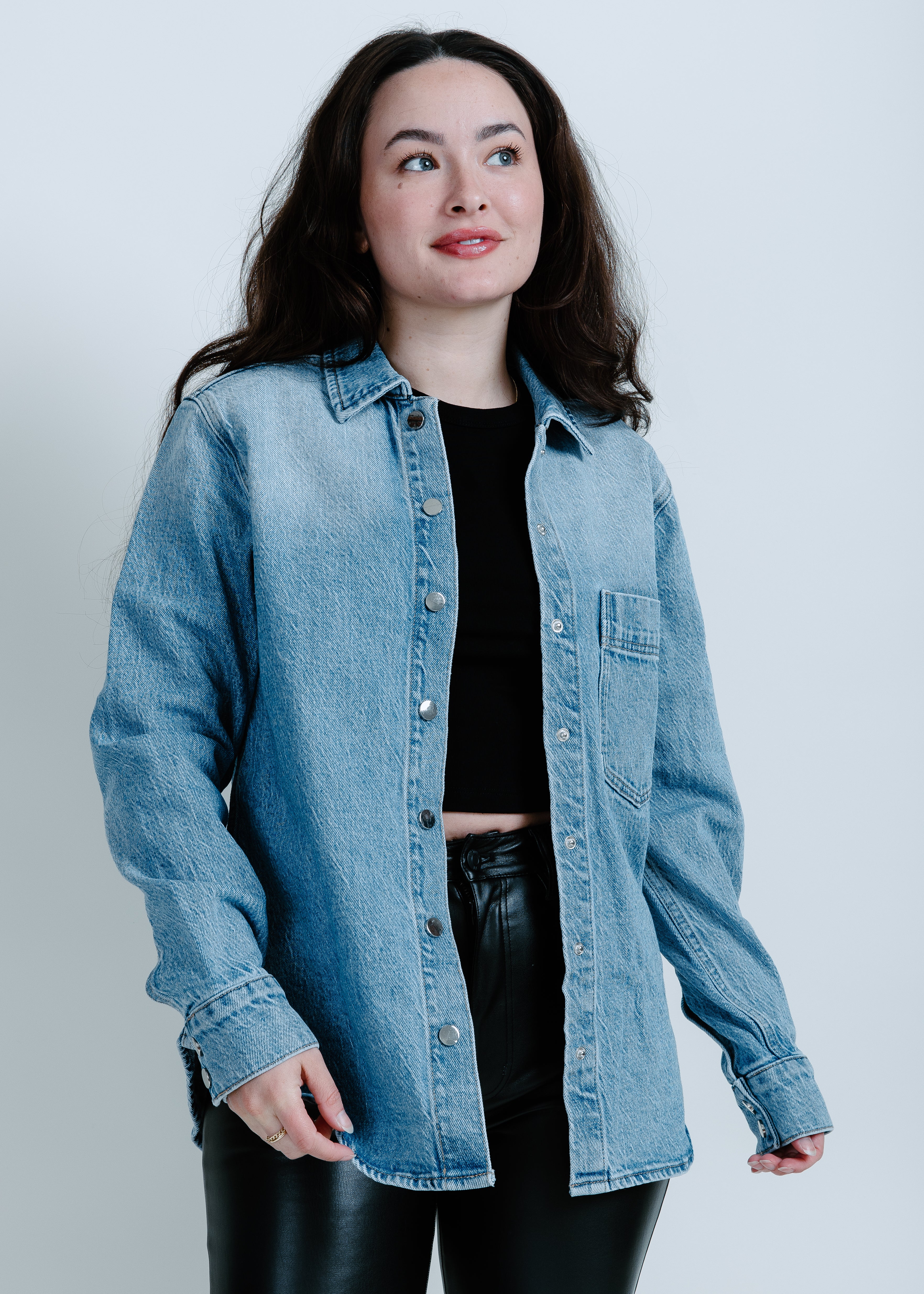 Made with high-quality and featuring a stylish silver button-up detail, you'll love how versatile and durable this Liv Long Sleeve Denim Shirt is, especially paired easily over our Ellen Tank in Black.