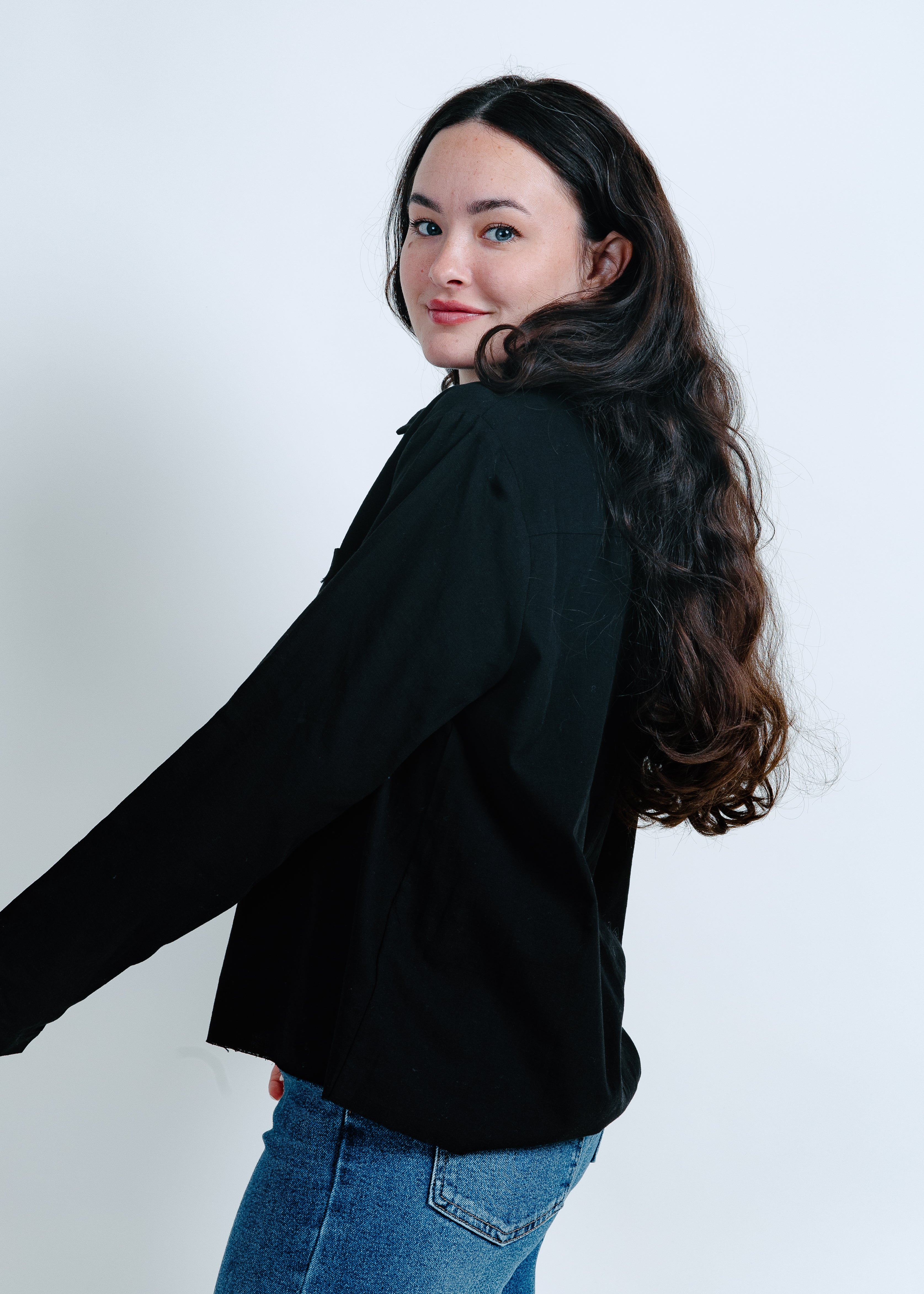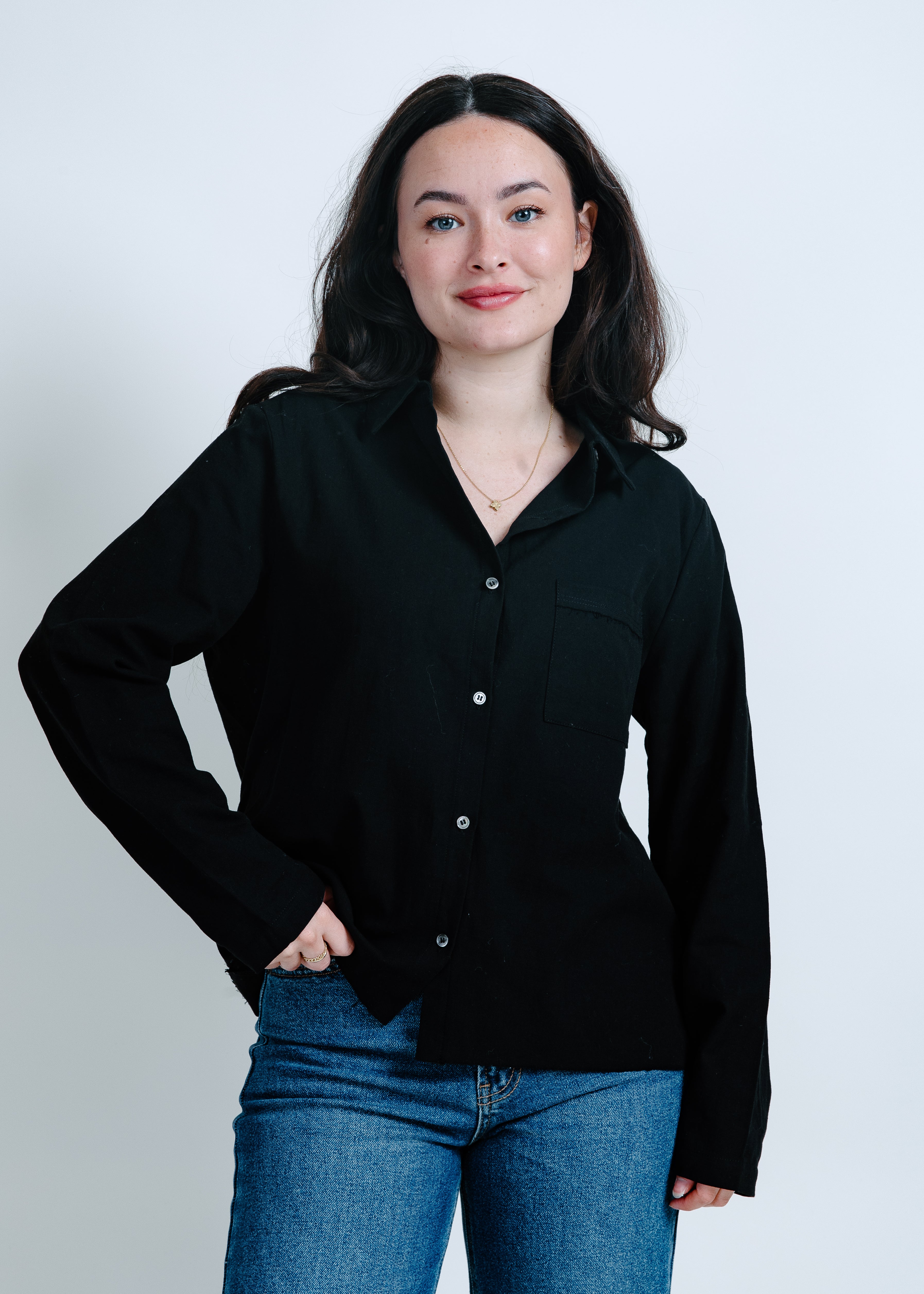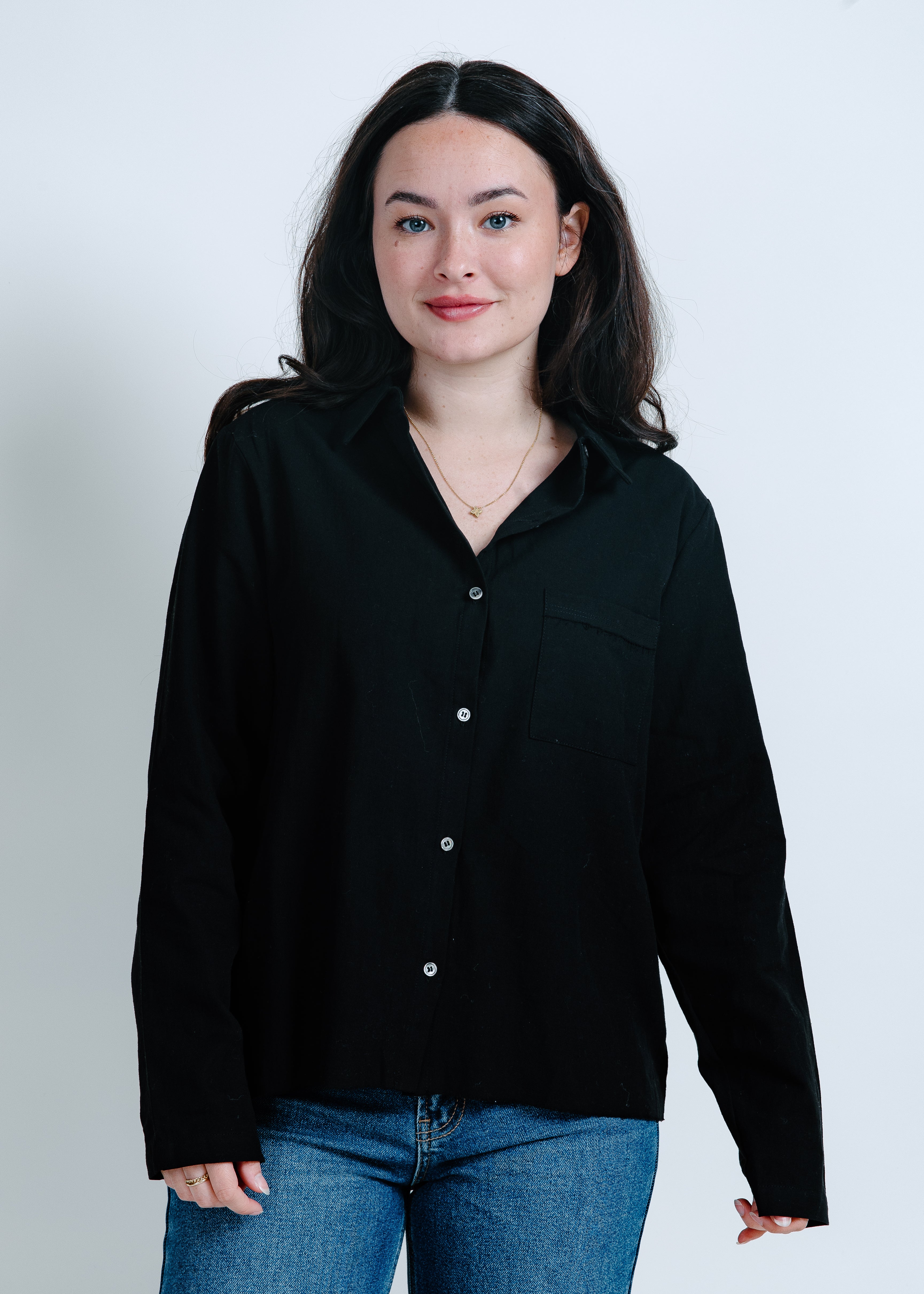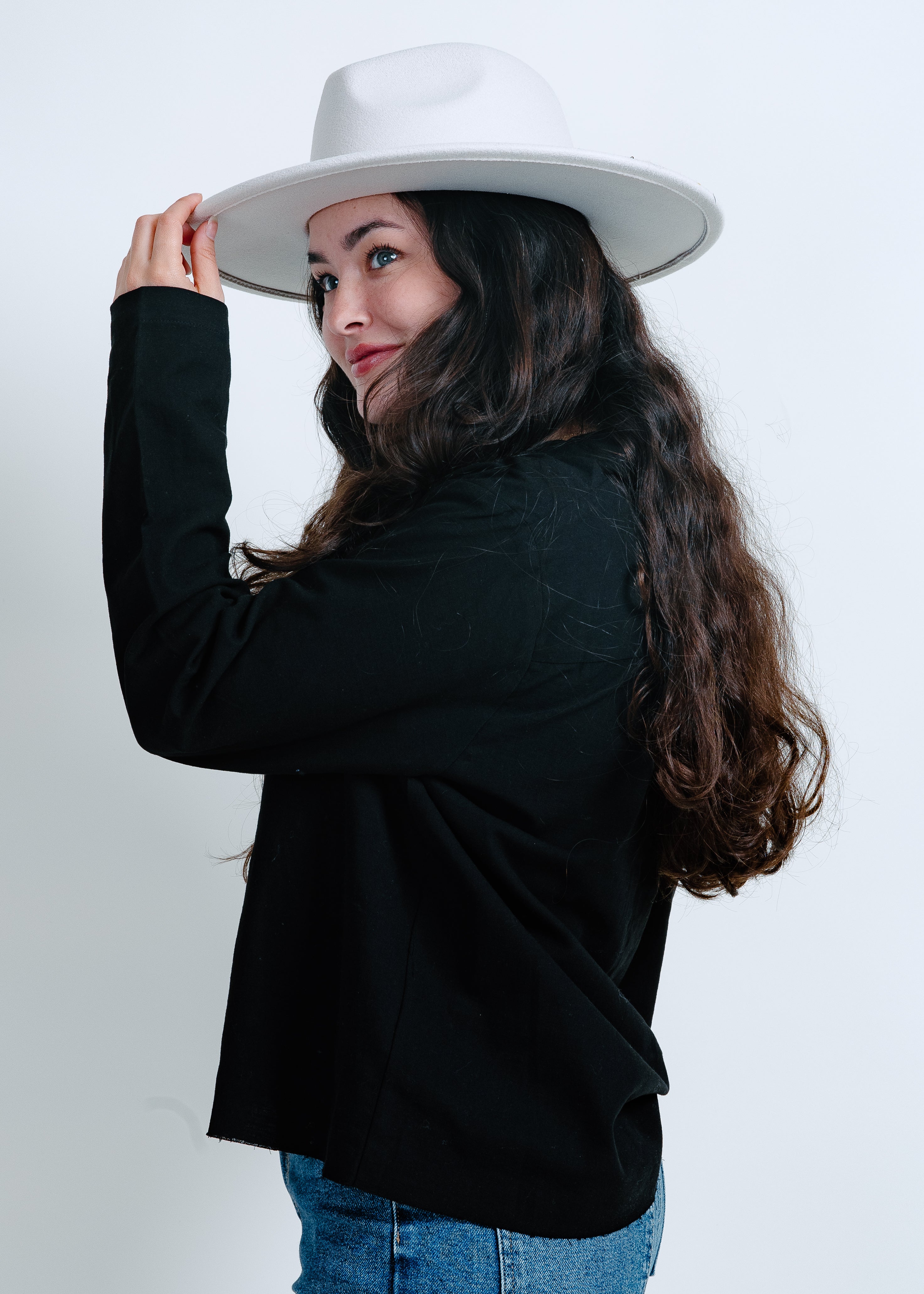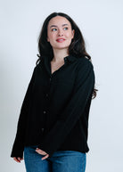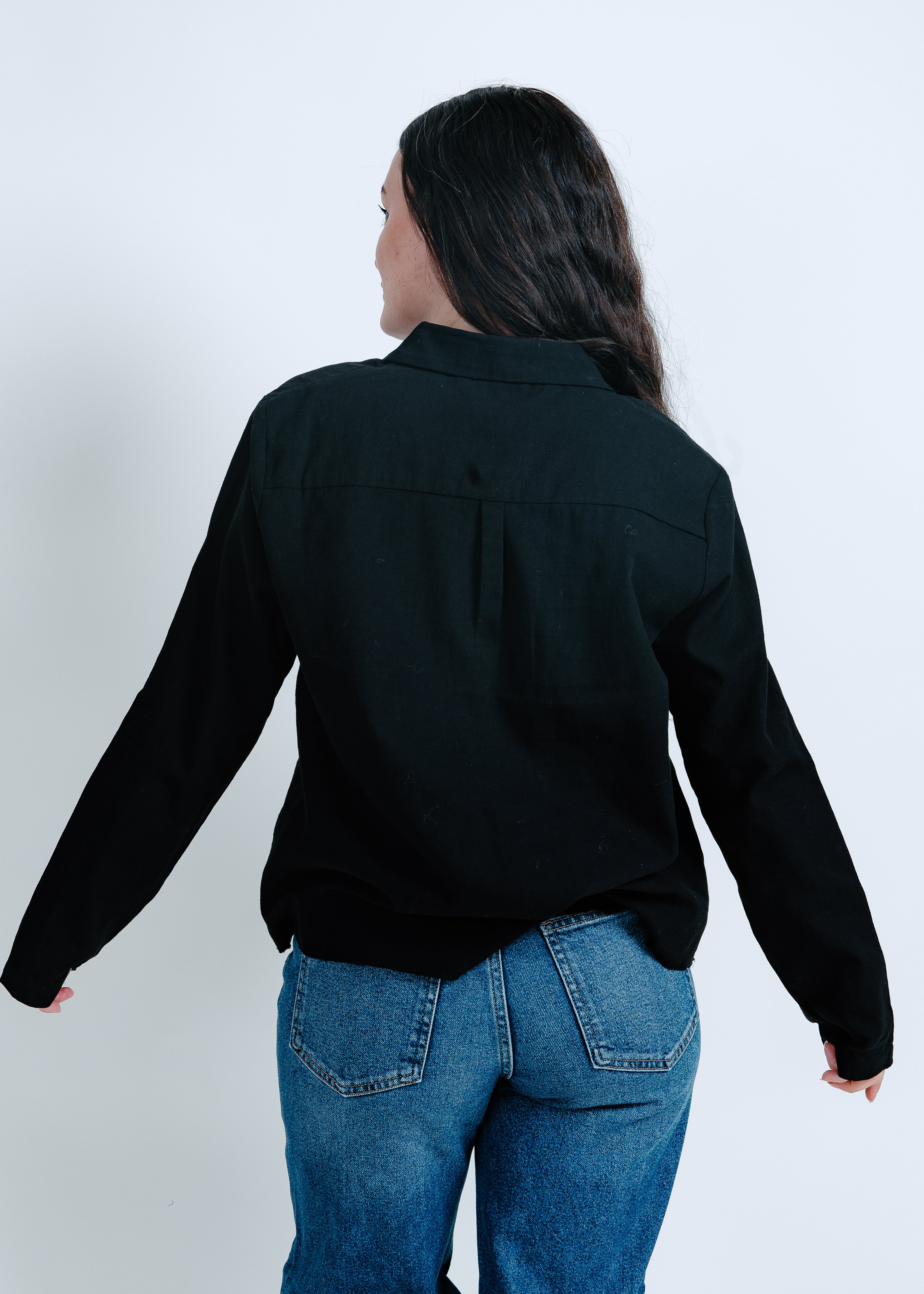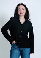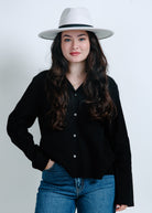 Stay stylish with the Sadie Button Down Top in Black. This professional yet comfortable top is a classic choice for any occasion, paired with jeans and our Joan Wester Hat in Beige for a complete look!