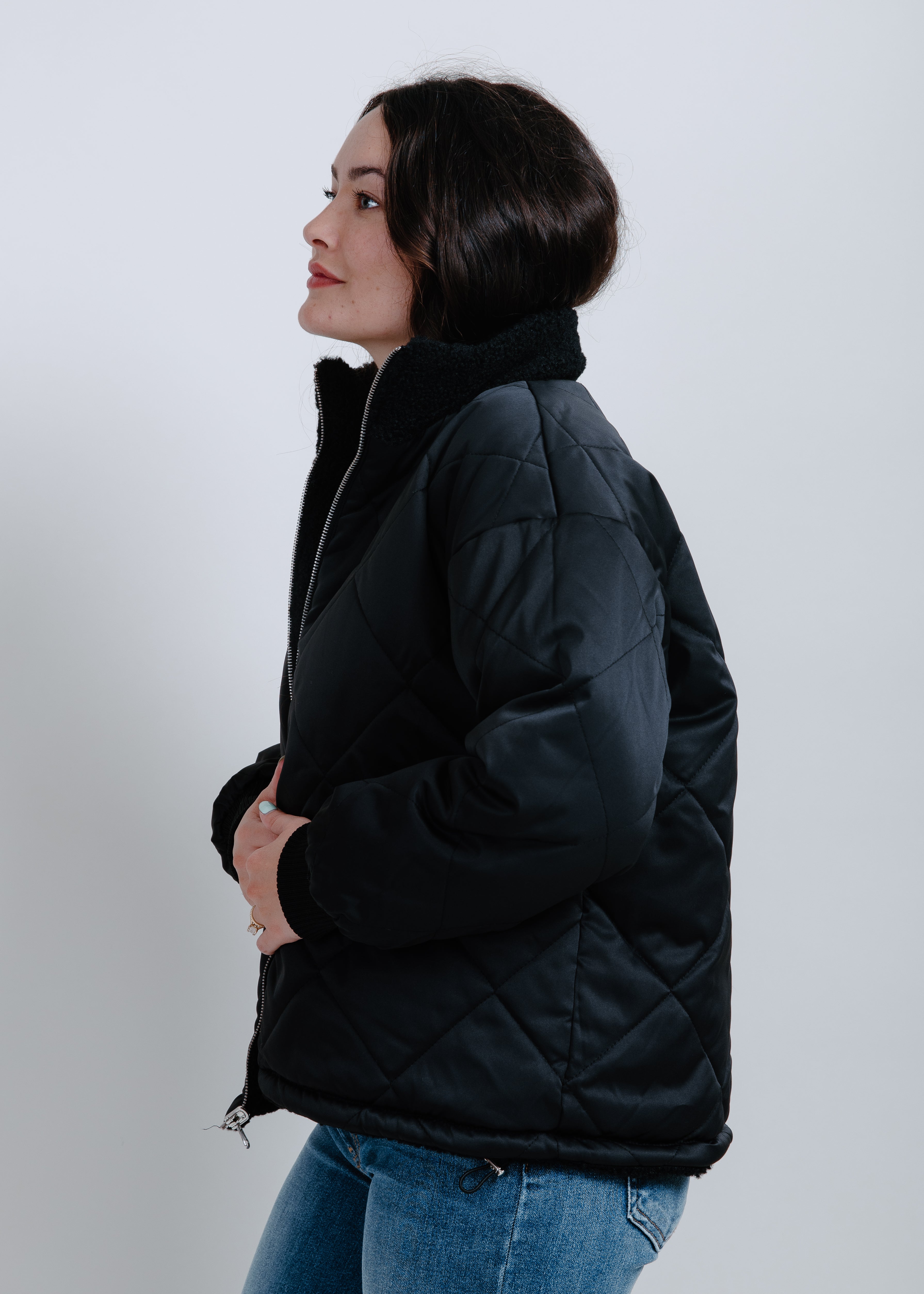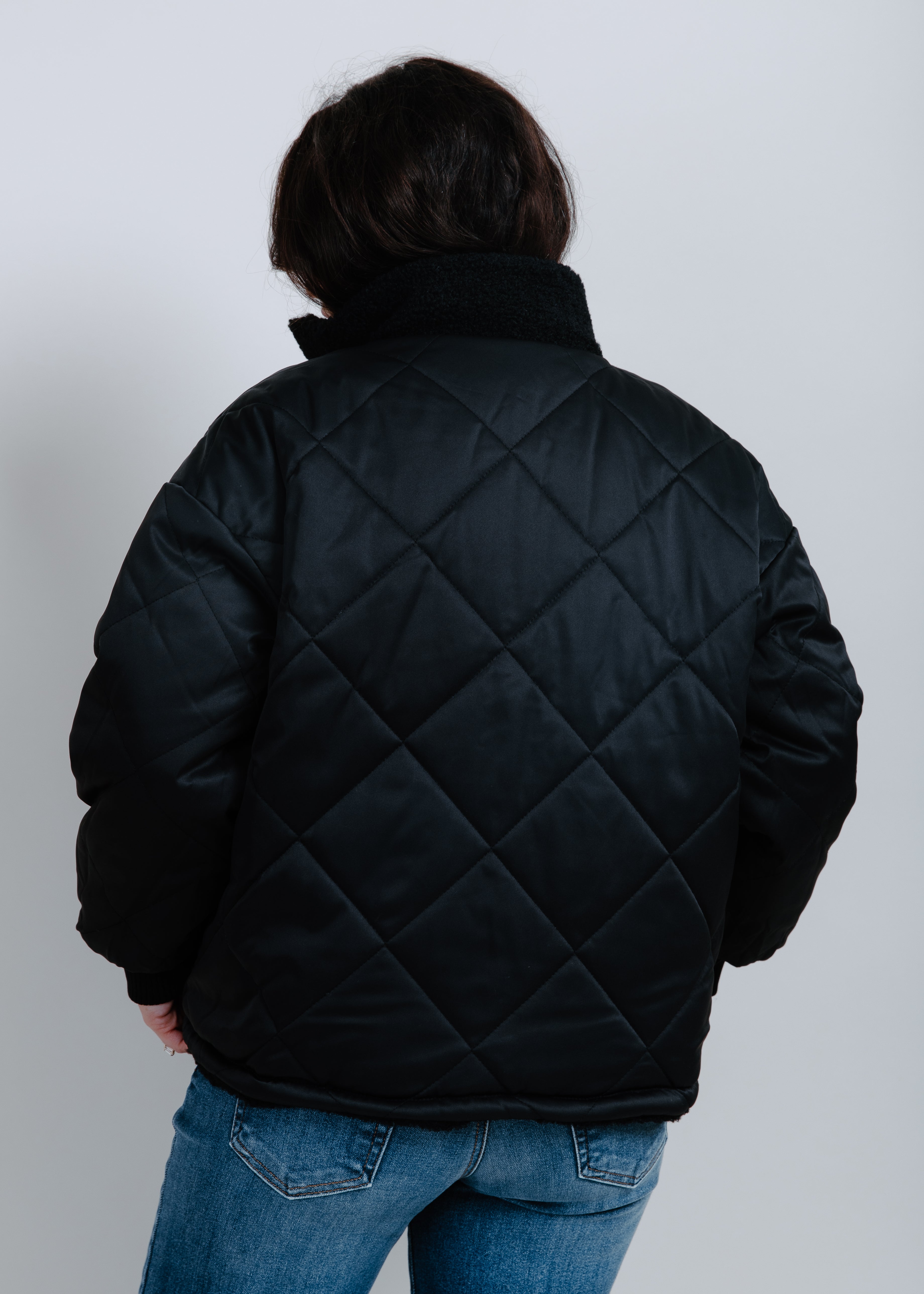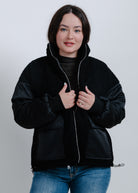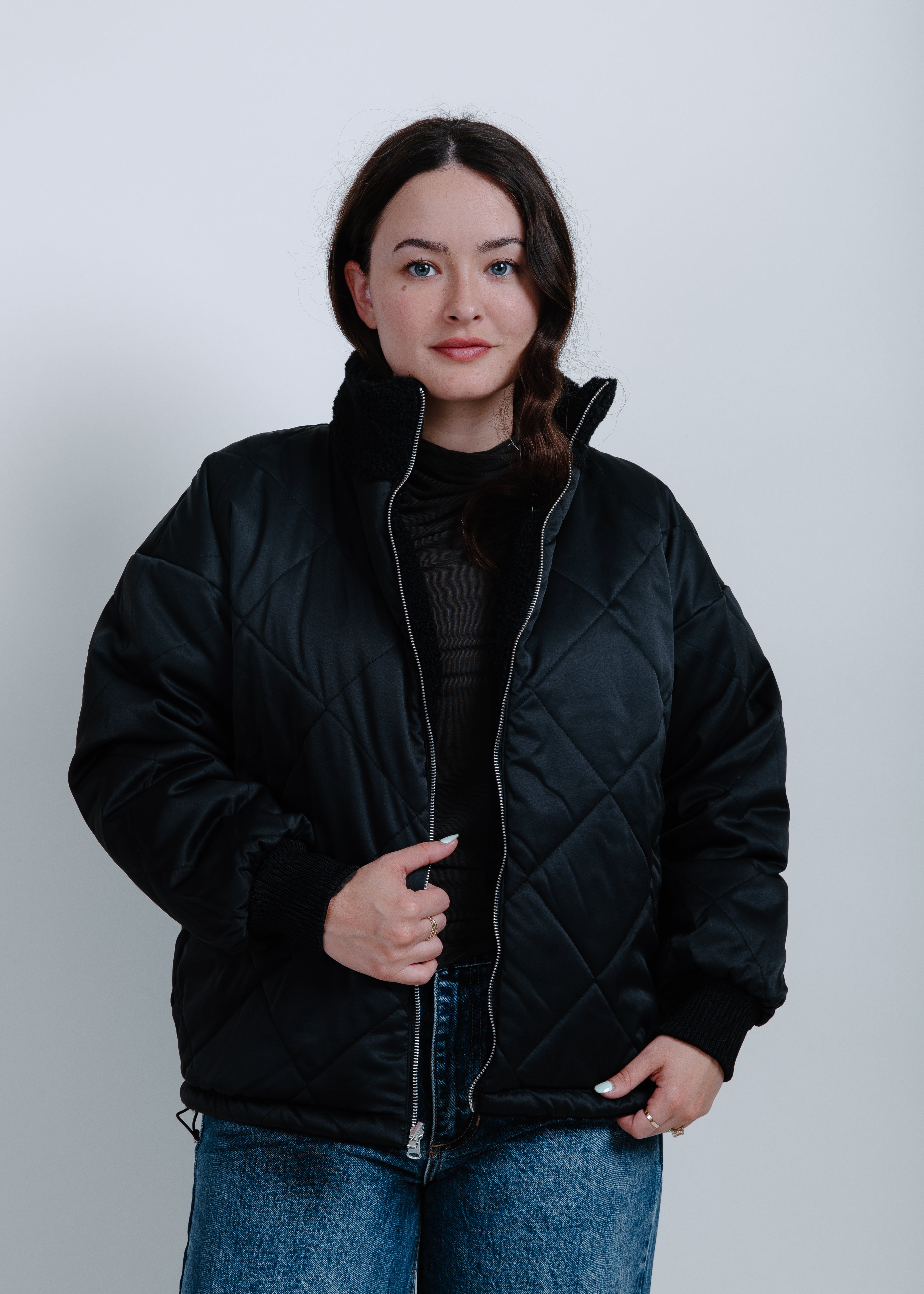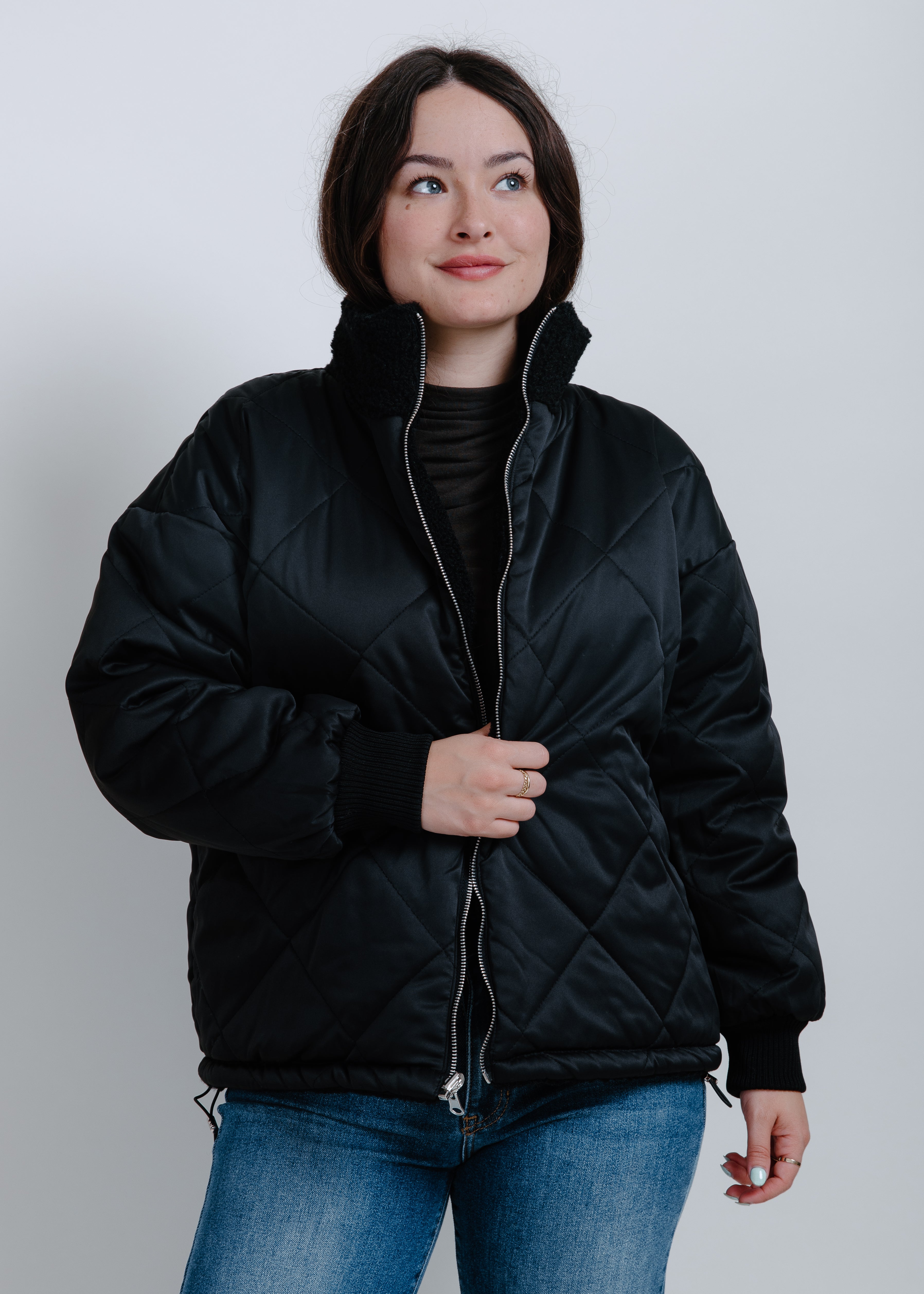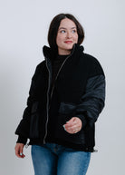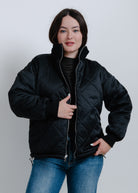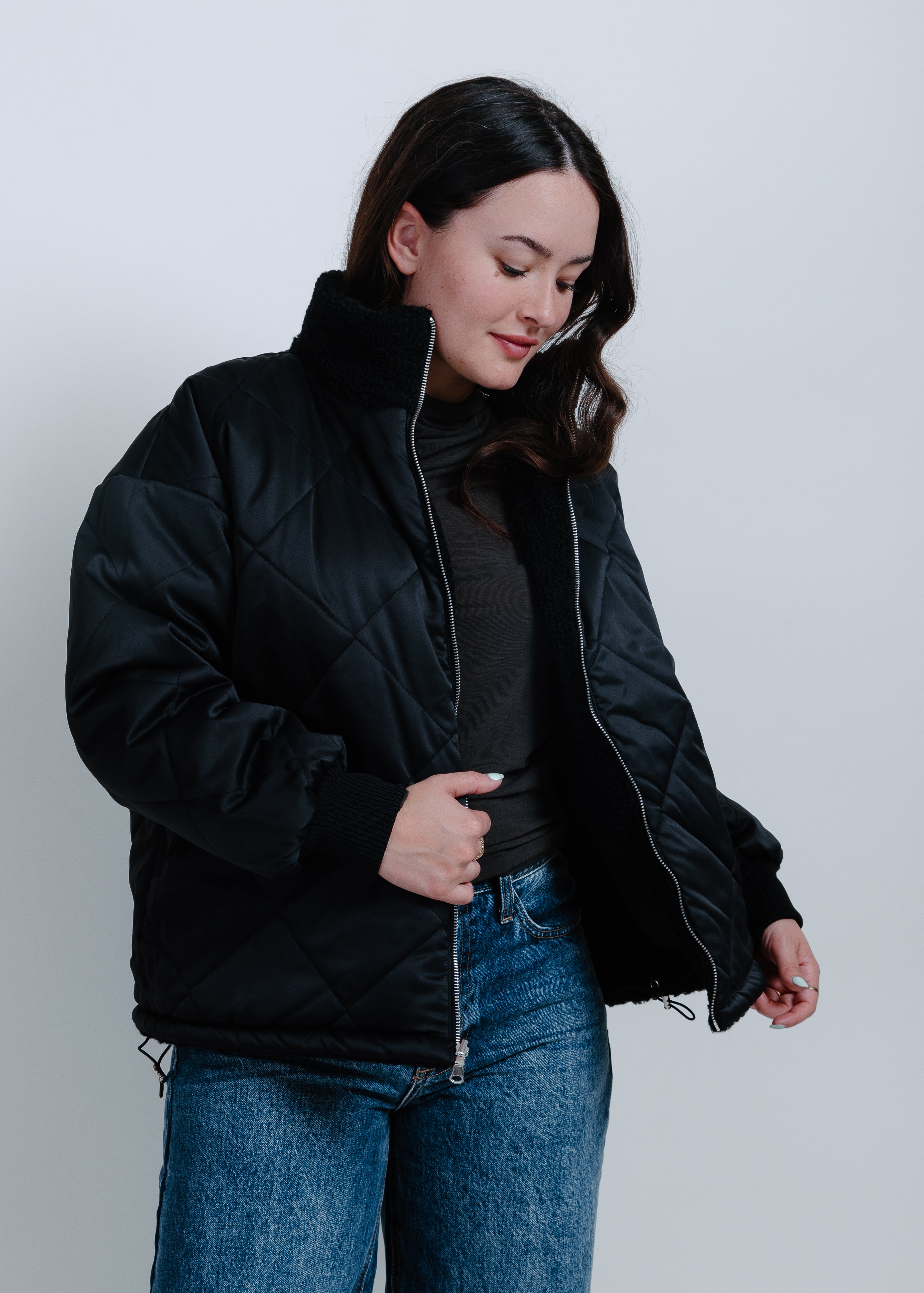 Introducing the Kiara Reversible Puffer Jacket, a solid solution for unpredictable weather! This black jacket features pockets on one side, zip-up details that work for both sides, and a fuzzy material on one side while the other boasts a pleated design. Stay stylish and warm with each side!