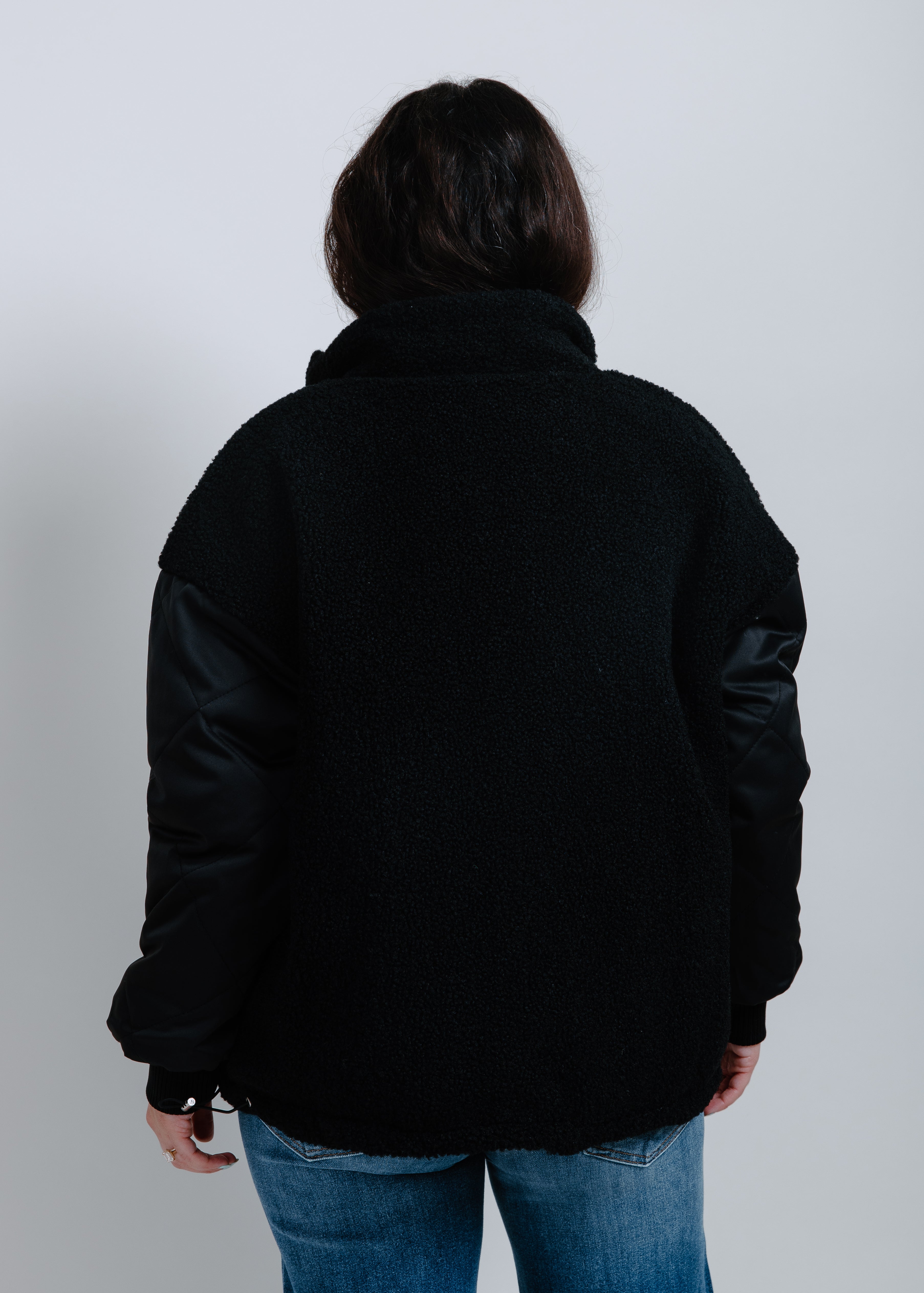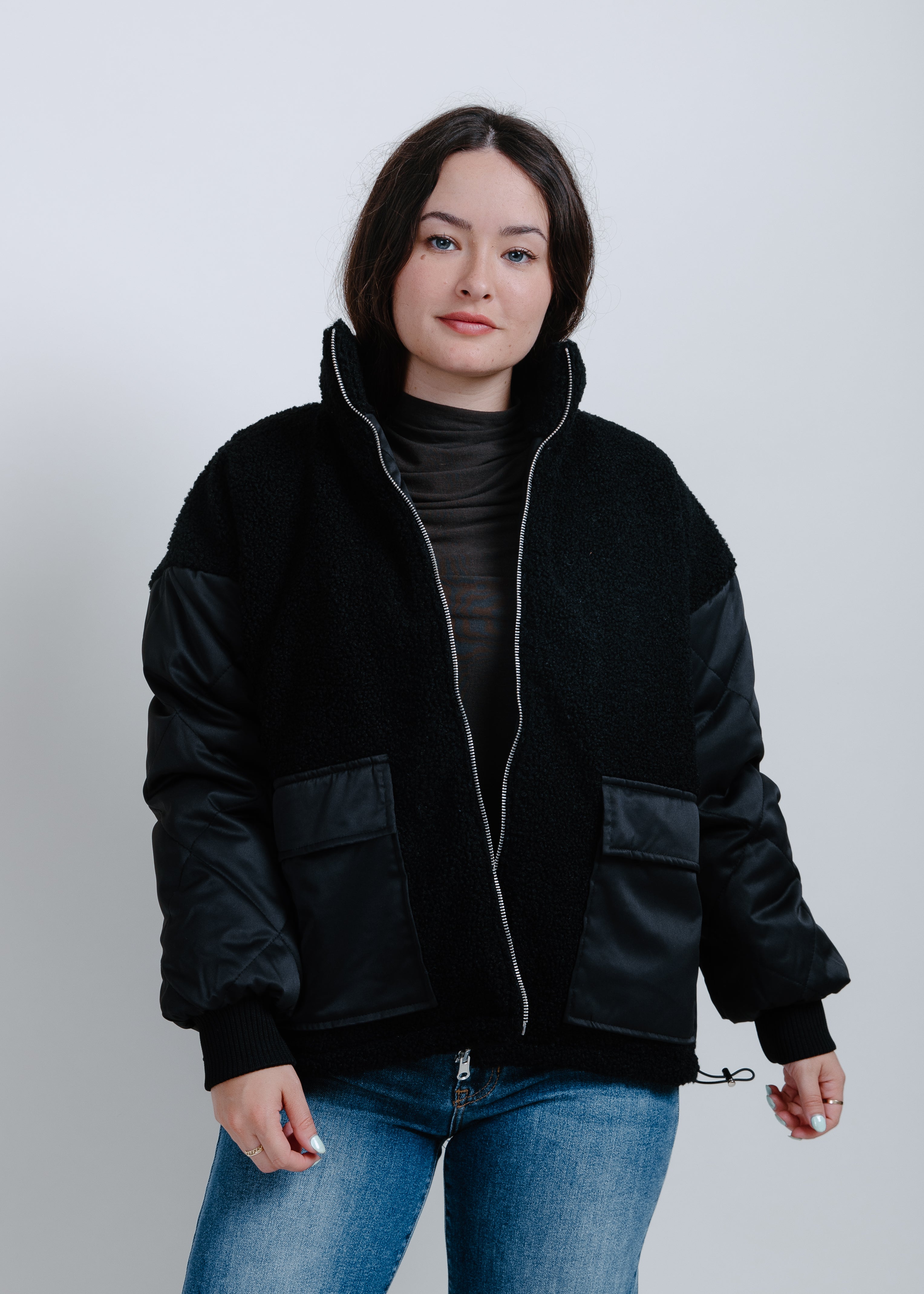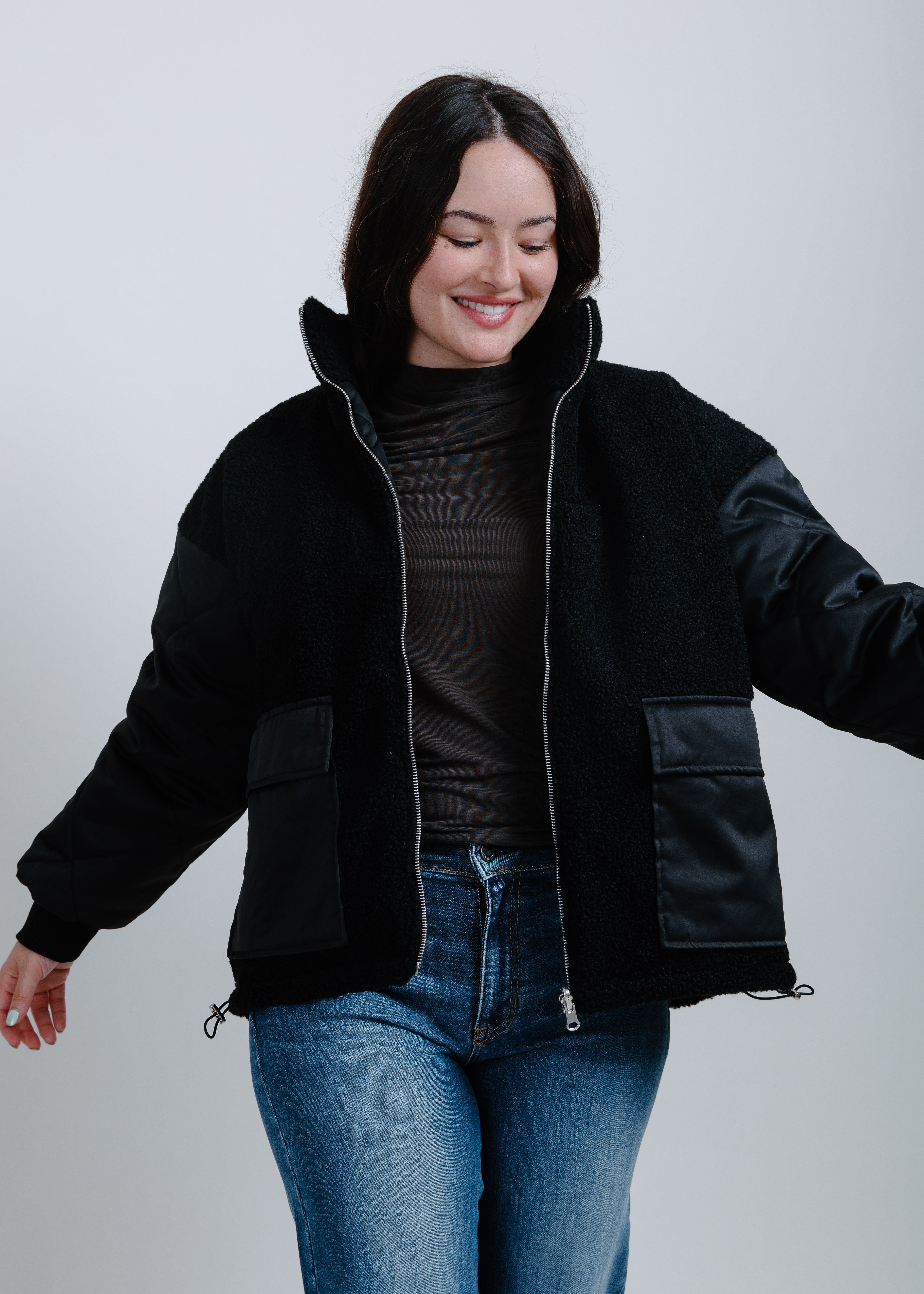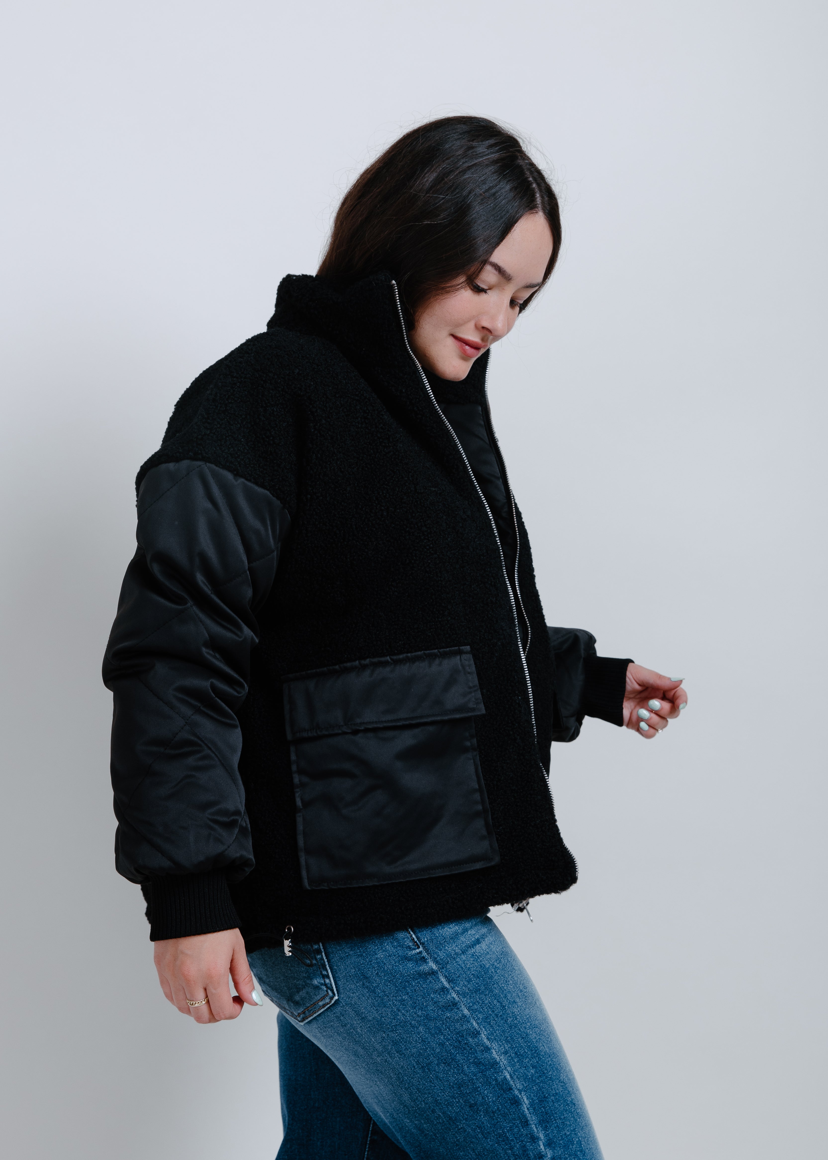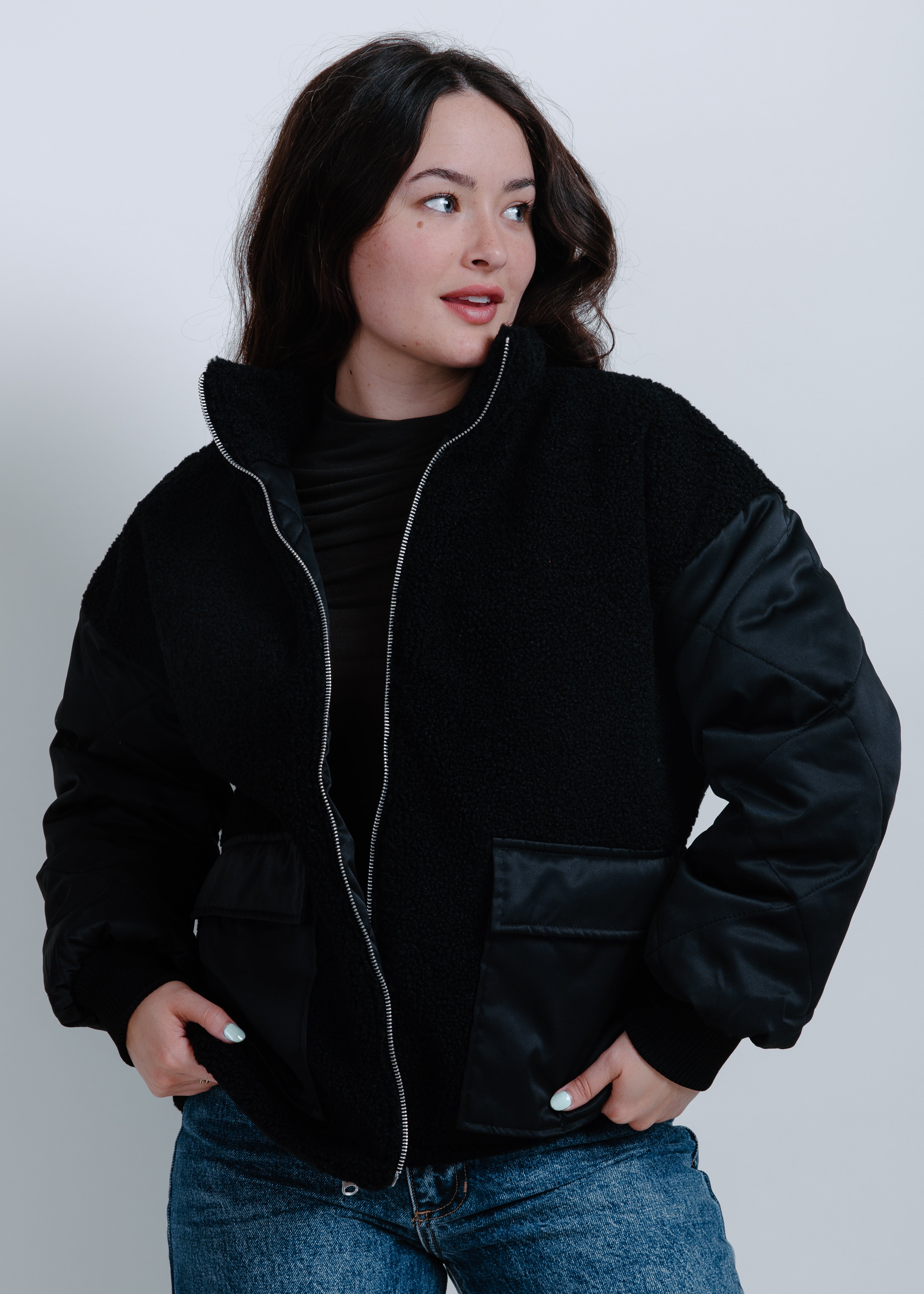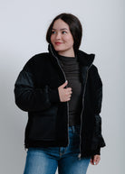 Introducing the Kiara Reversible Puffer Jacket, a solid solution for unpredictable weather! This black jacket features pockets on one side, zip-up details that work for both sides, and a fuzzy material on one side while the other boasts a pleated design. Stay stylish and warm with each side!