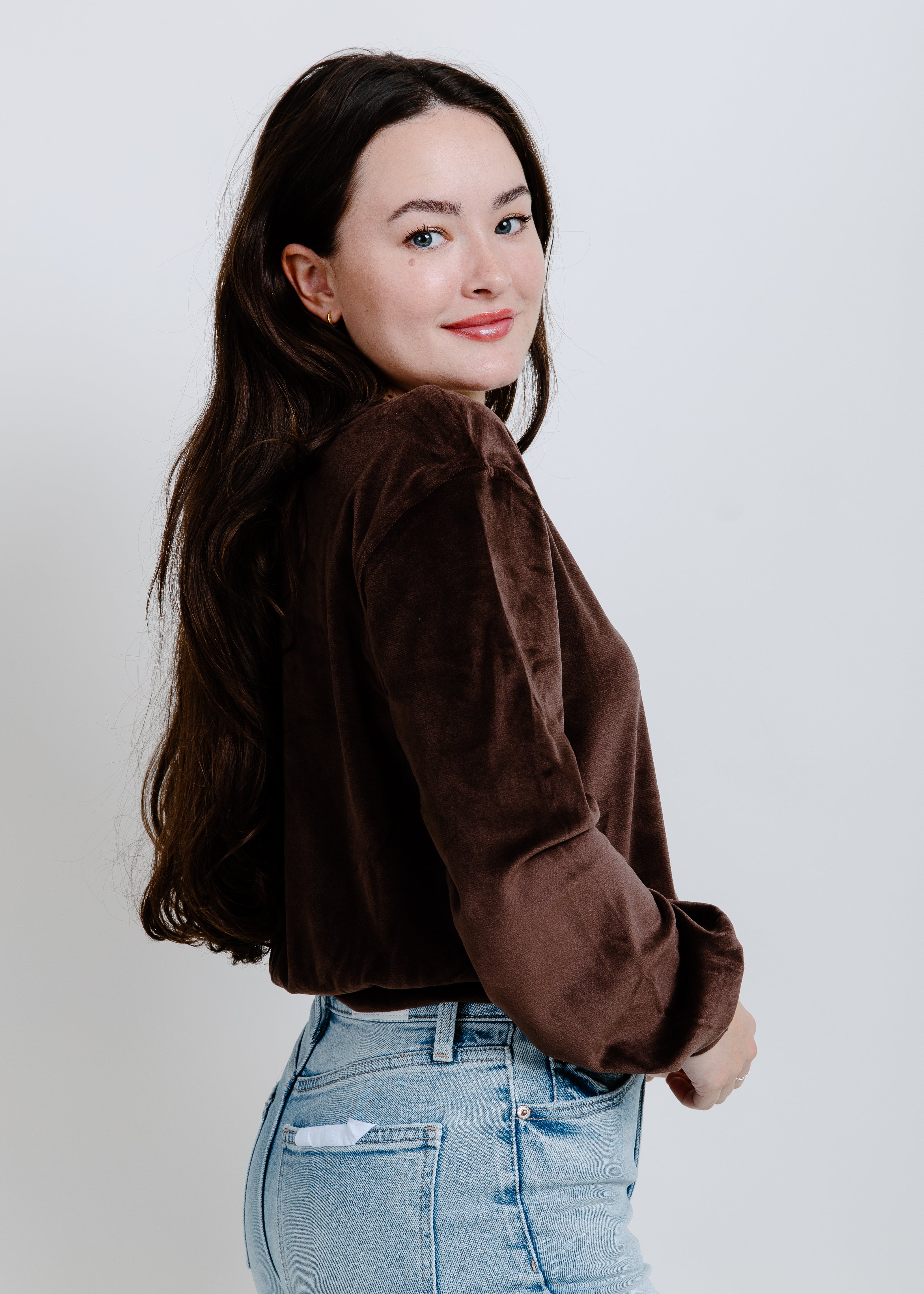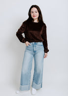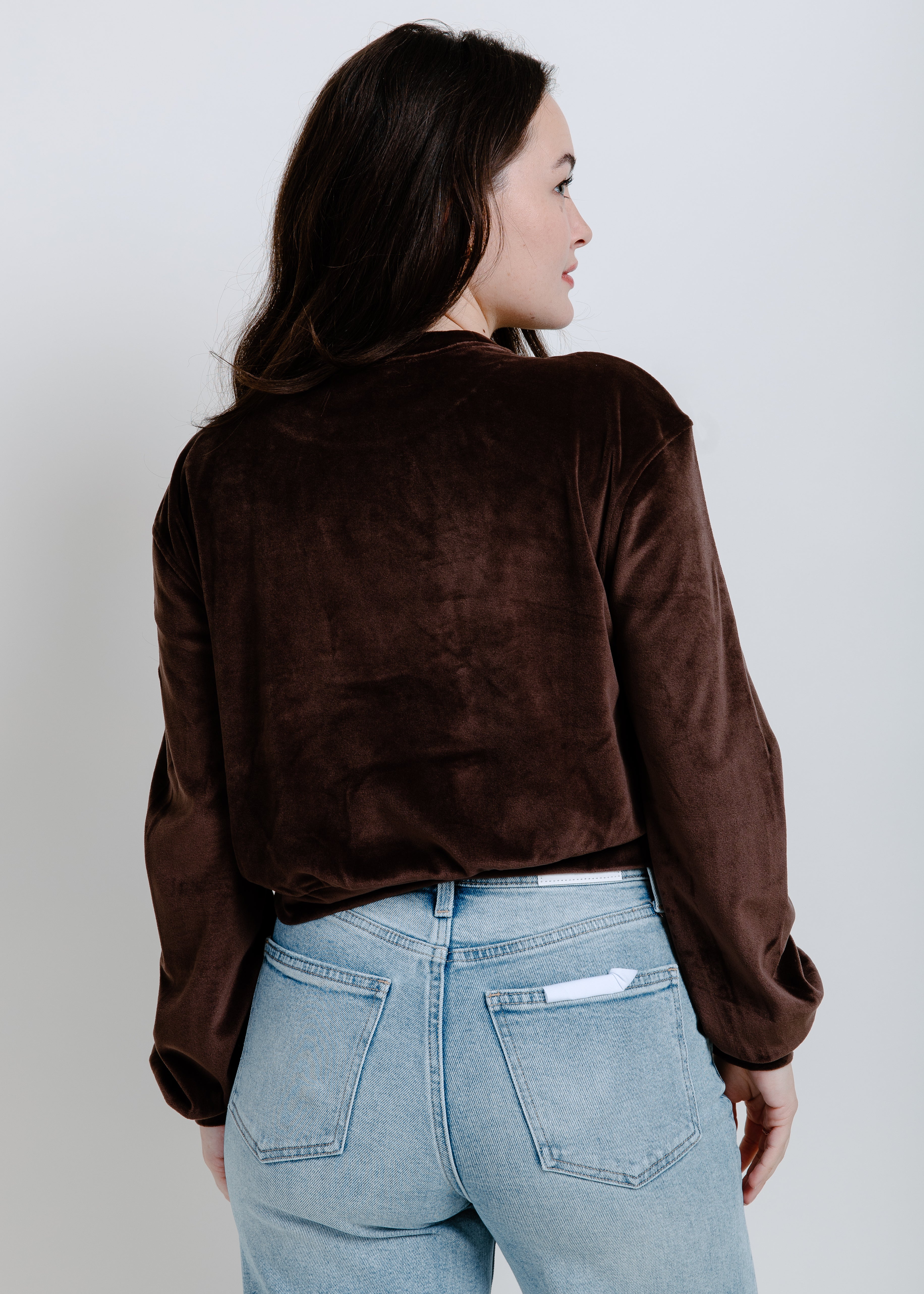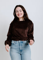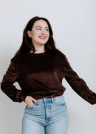 Indulge in the soft and luxurious feel of our Virgina Velvet Crewneck in a rich chocolate brown color. Pair it with jeans to elevate your style. Because who says you can't be comfortable and chic at the same time?