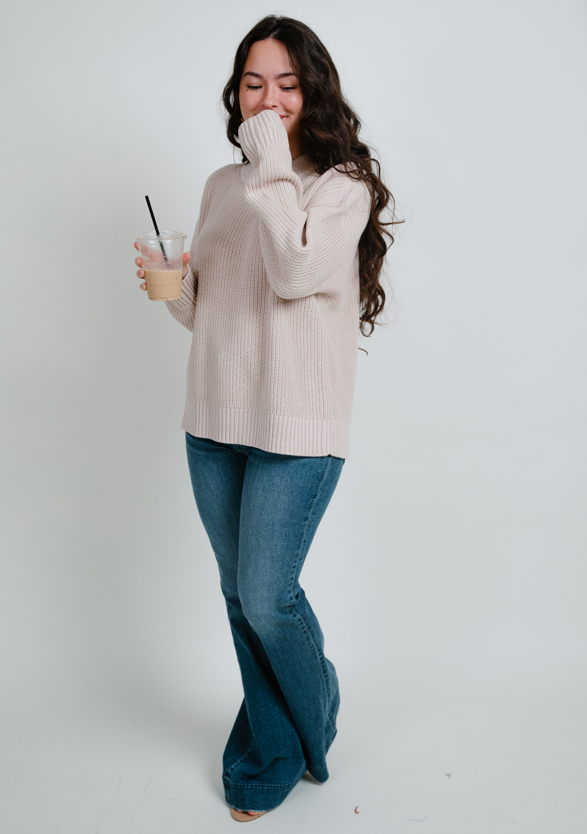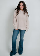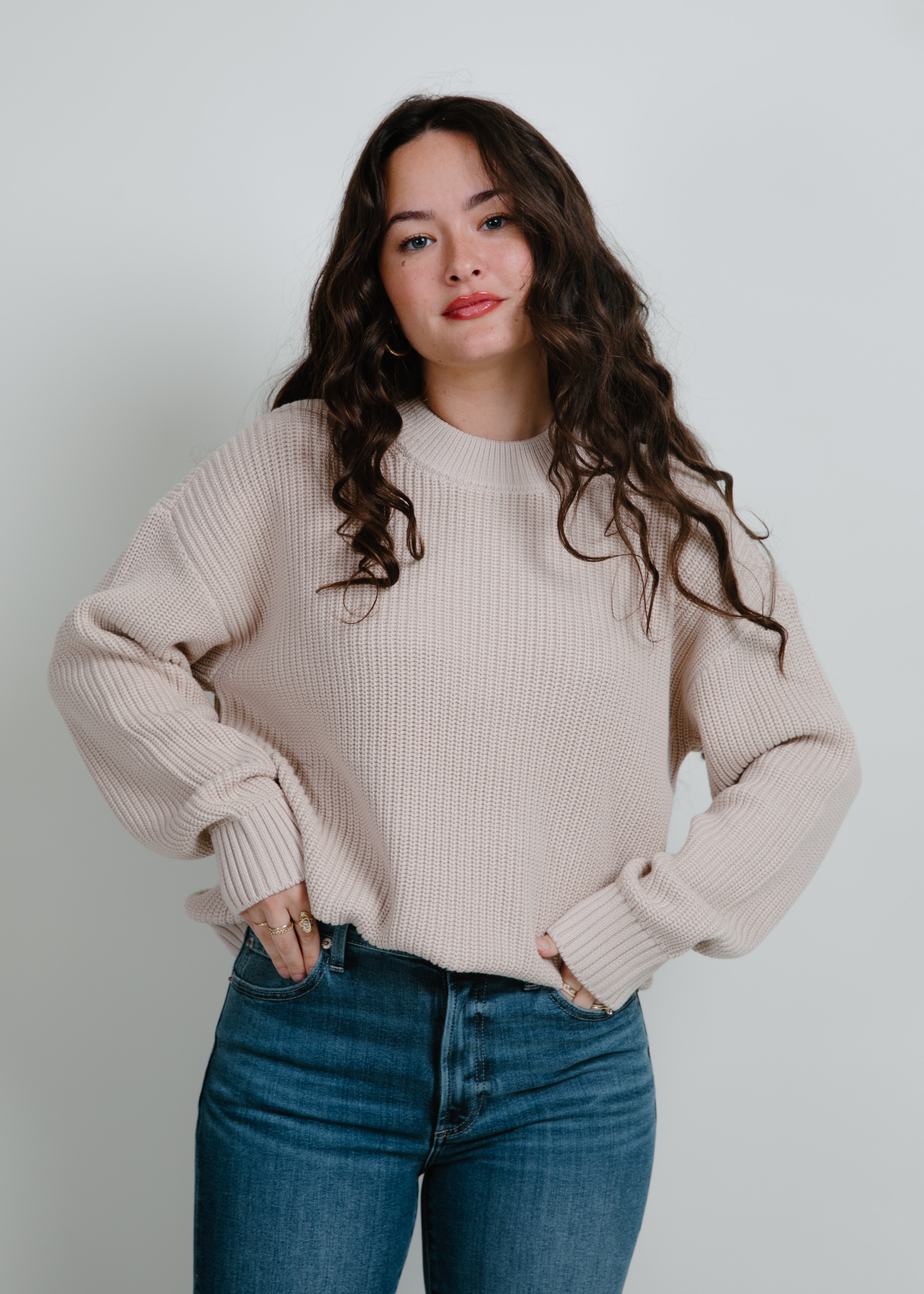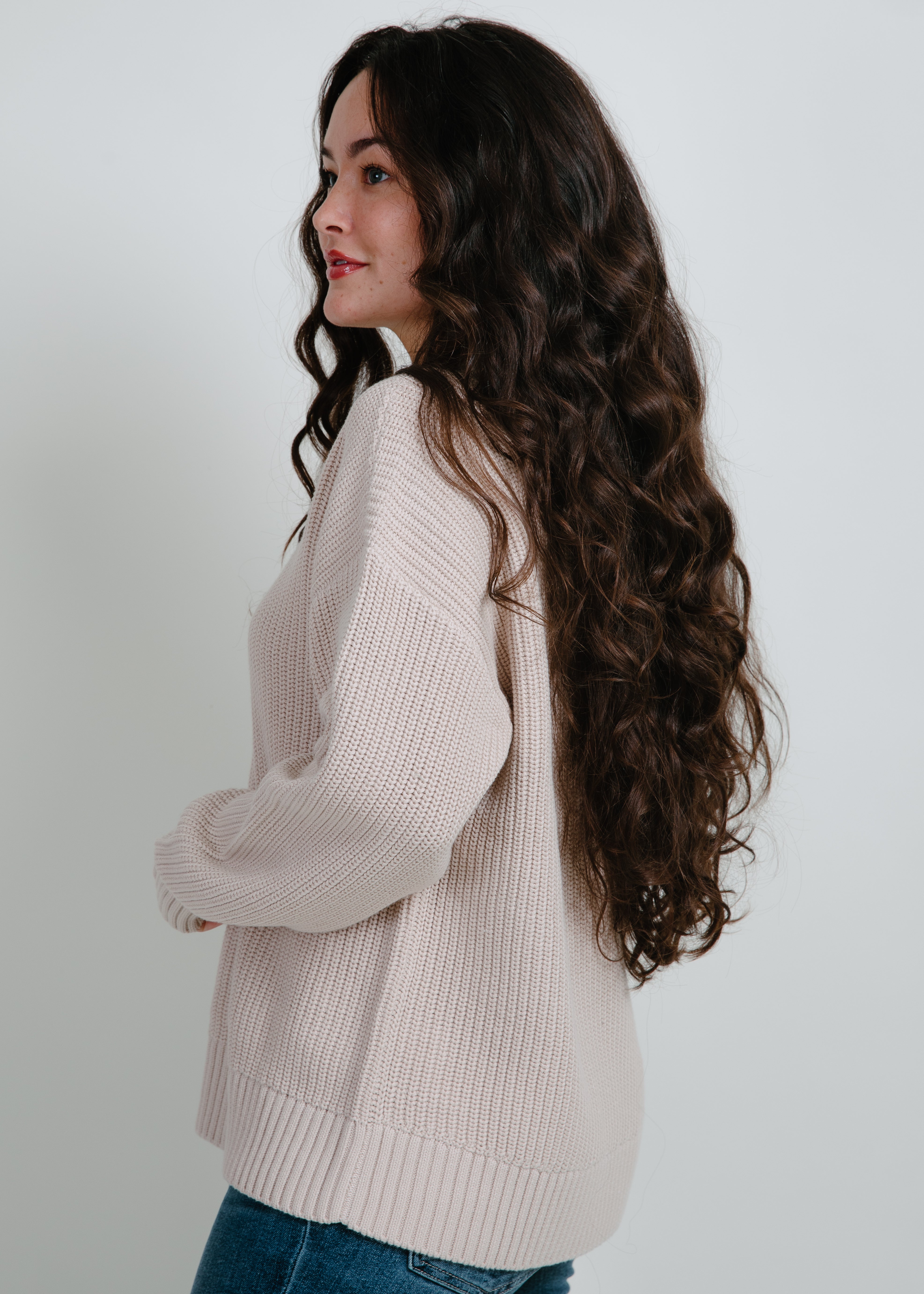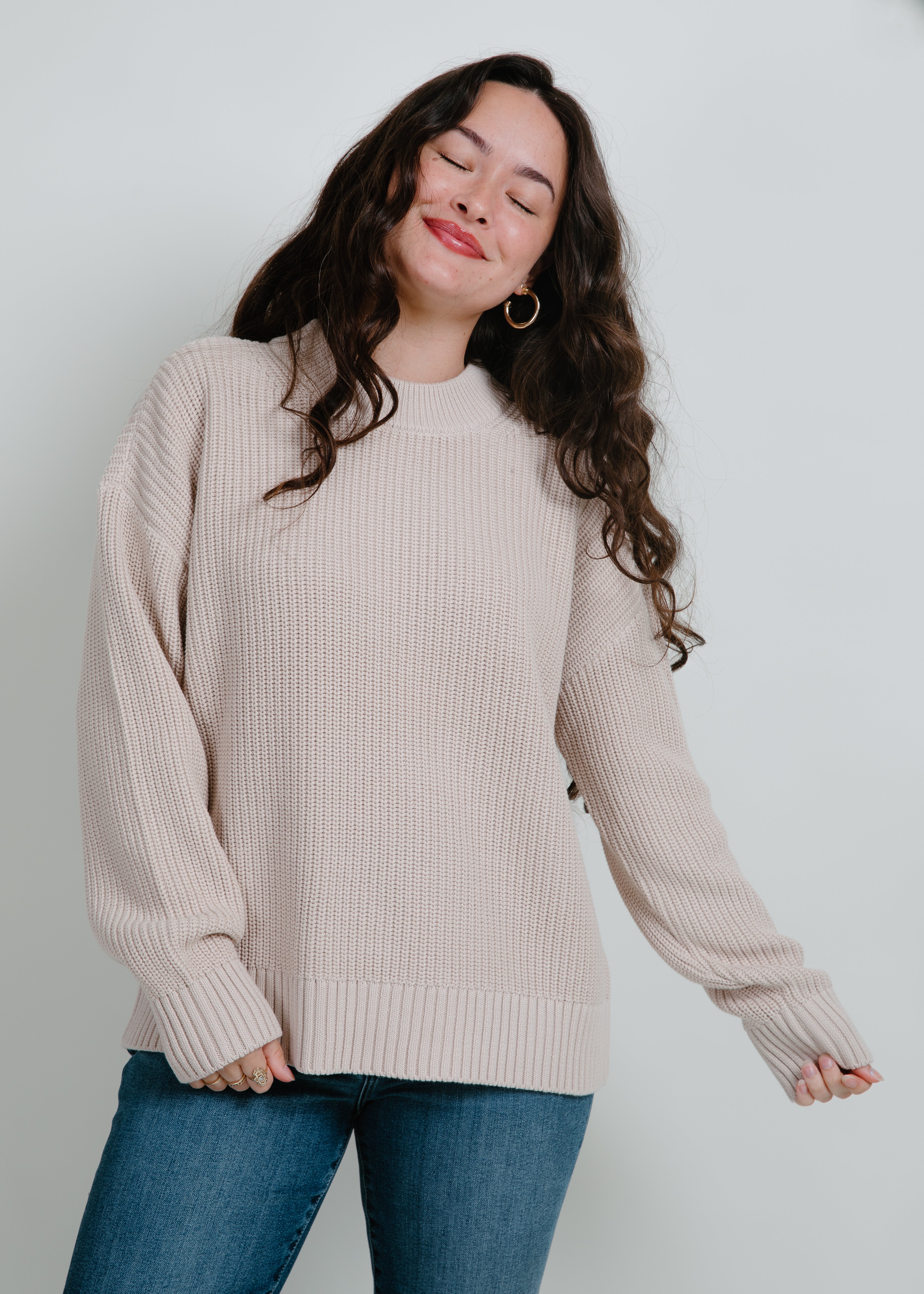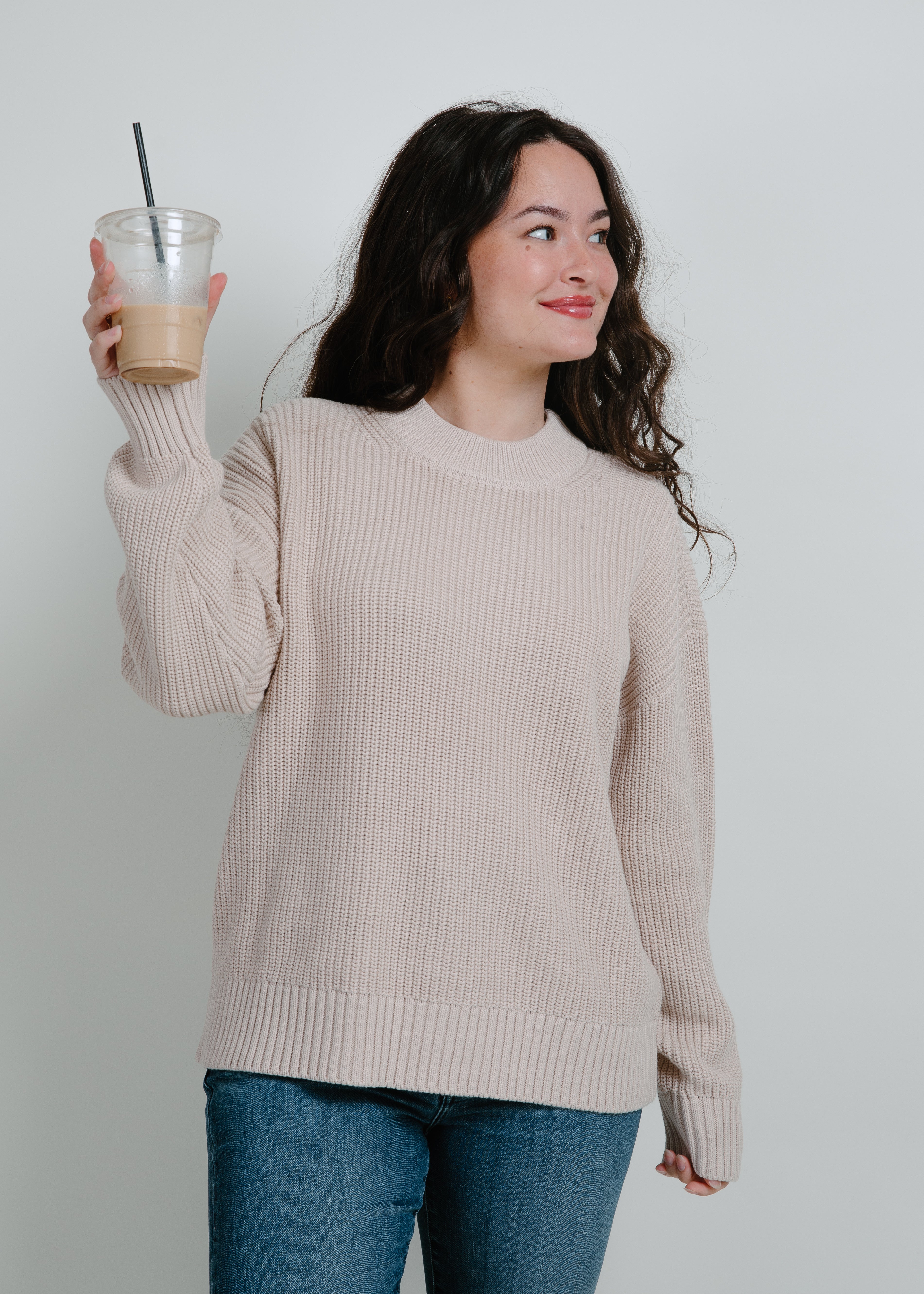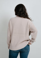 The Eve Sweater in Dove is a playful and versatile addition to your wardrobe. With its wide ribbed cuffs and mockneck collar, this longsleeve sweater is perfect for going into autumn weather. Made from a marled, waffle knit with cozy knitting and dropped shoulders, it offers a relaxed fit and cool undertones.